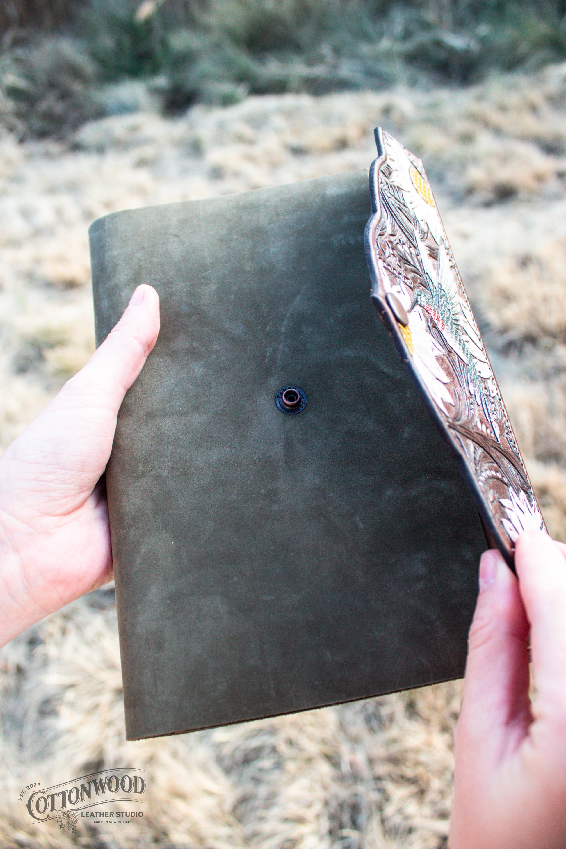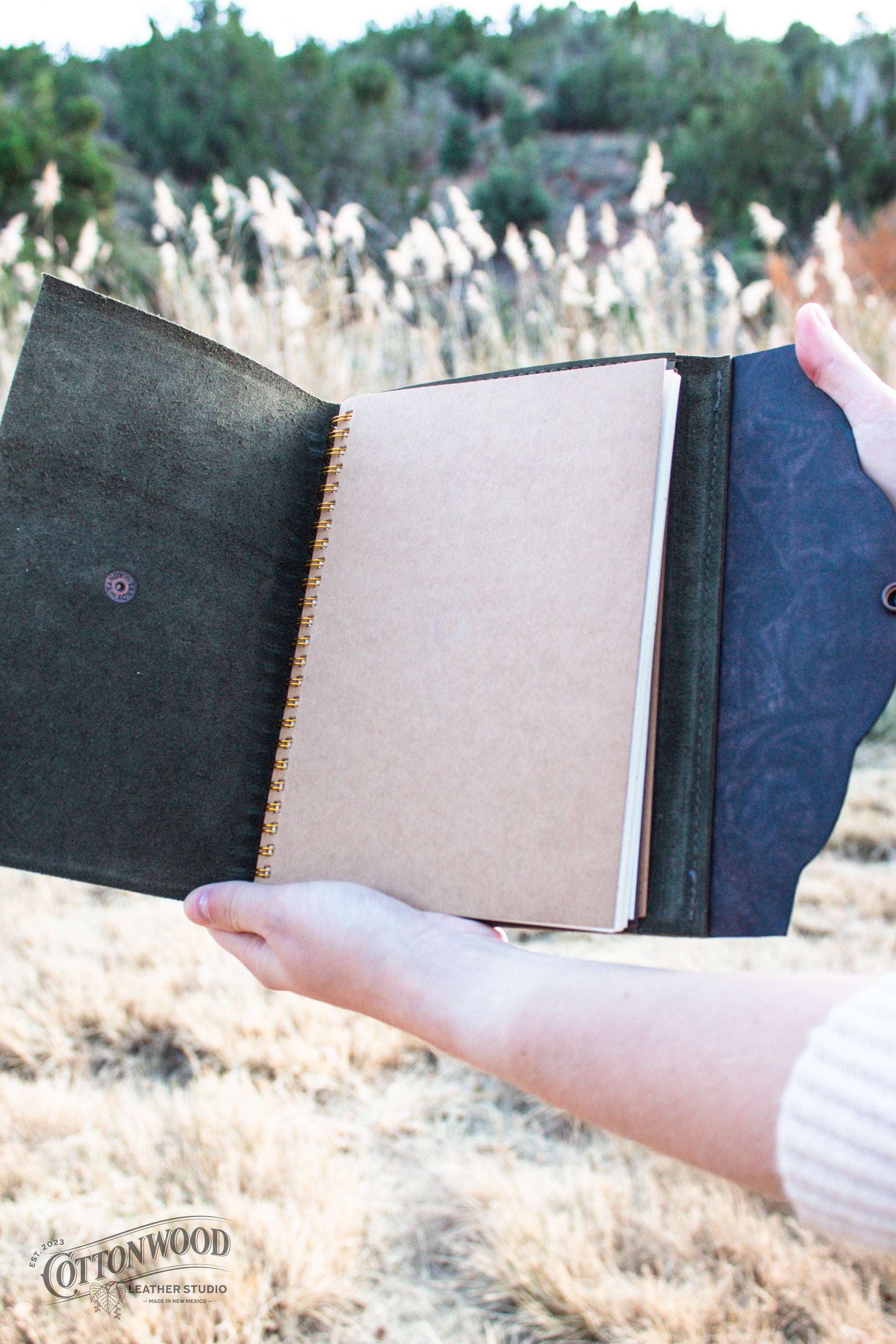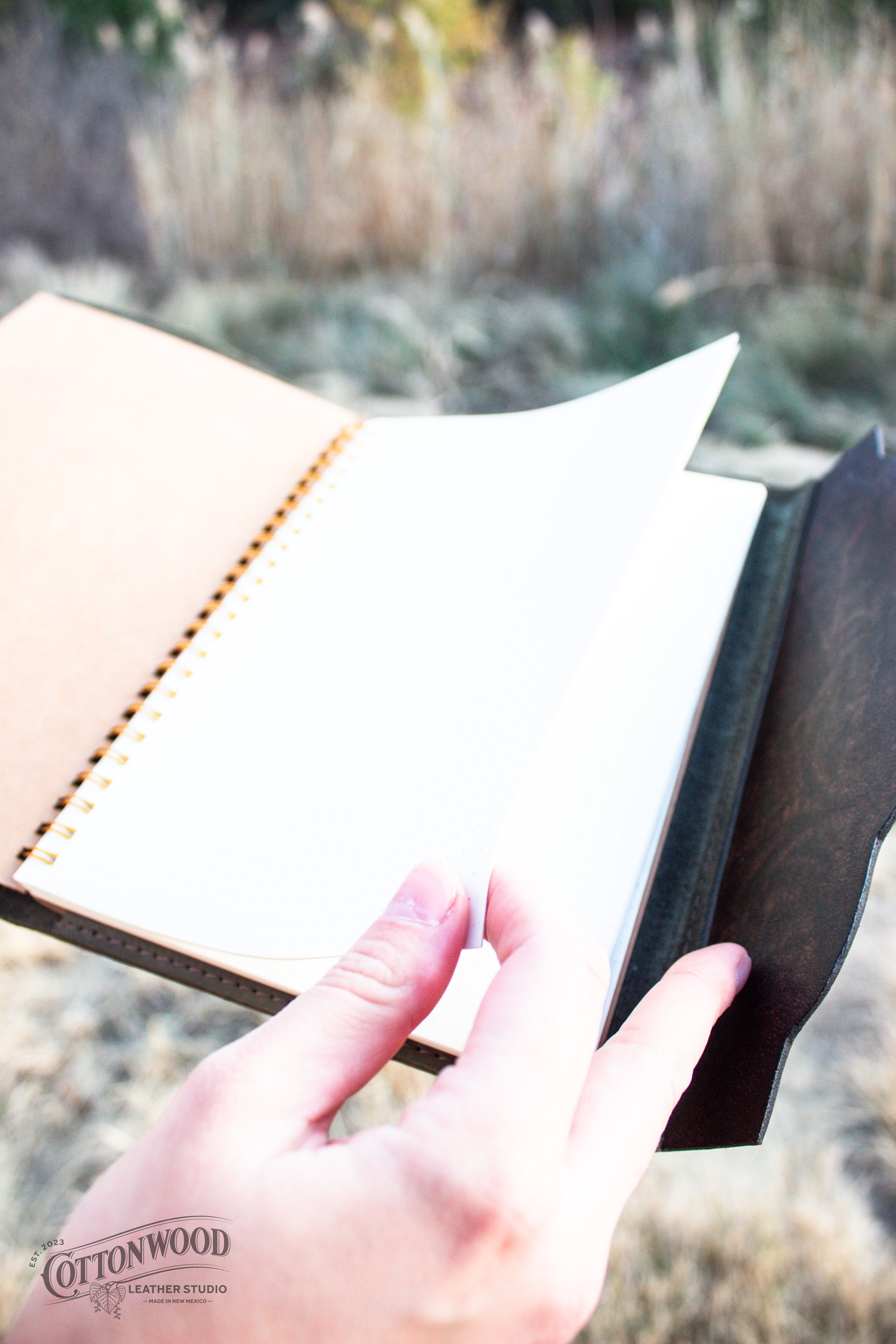 This style includes an A5 sized spiral notebook that is tucked securely into an inside pocket. This makes for easy changes once a notebook is filled. As well as a snap closure to keep everything locked up inside.