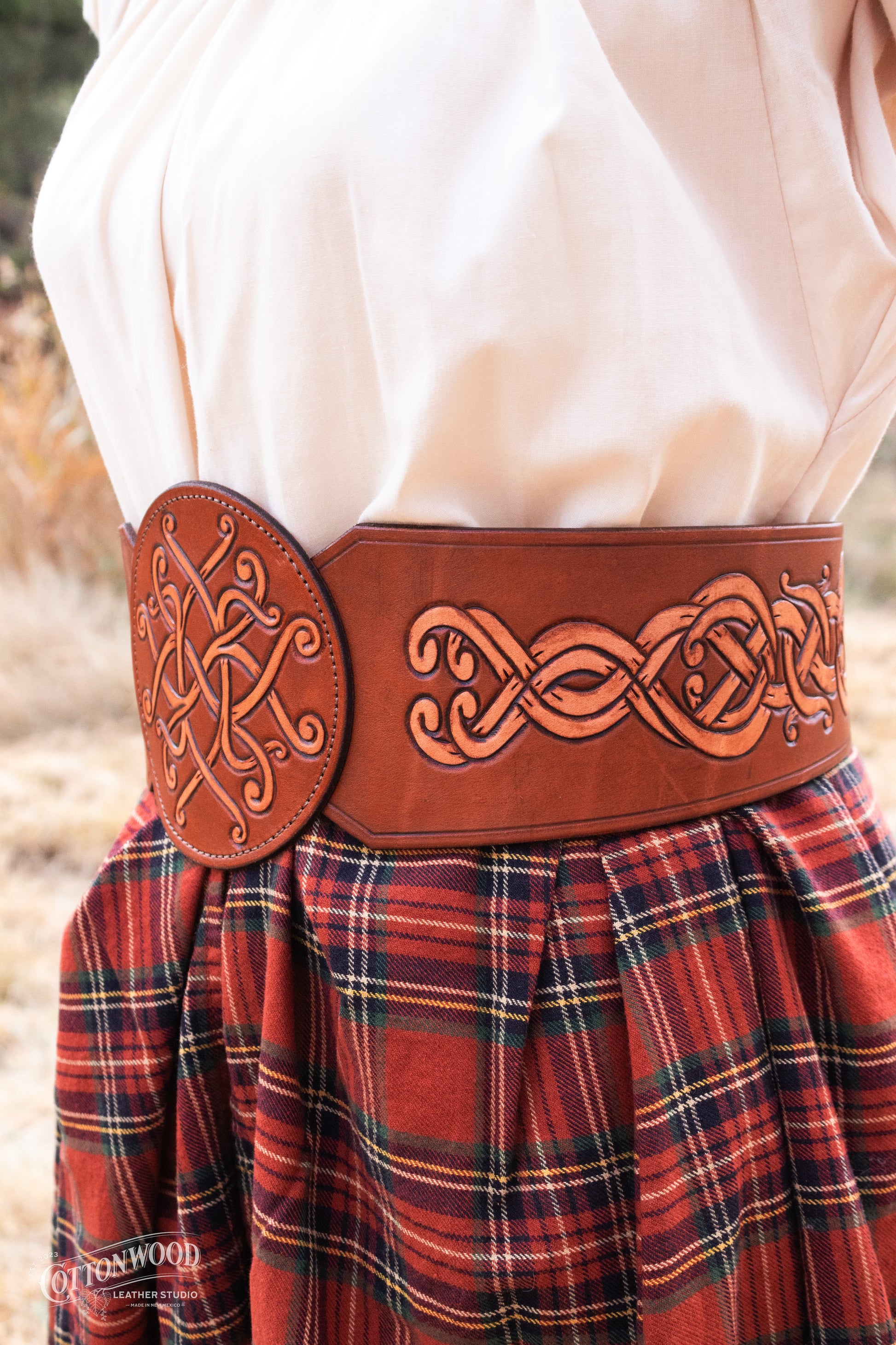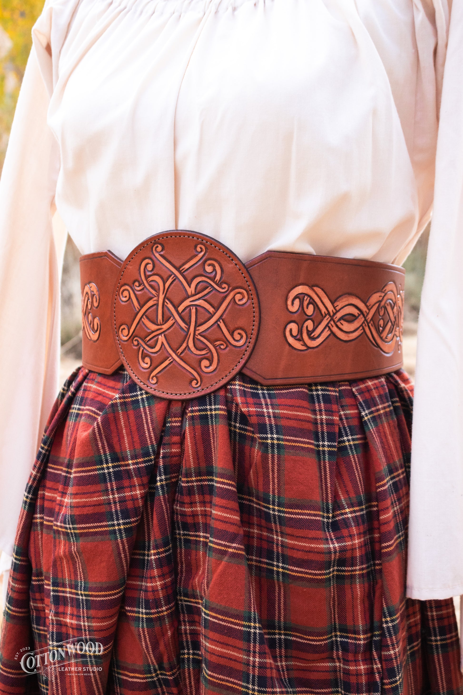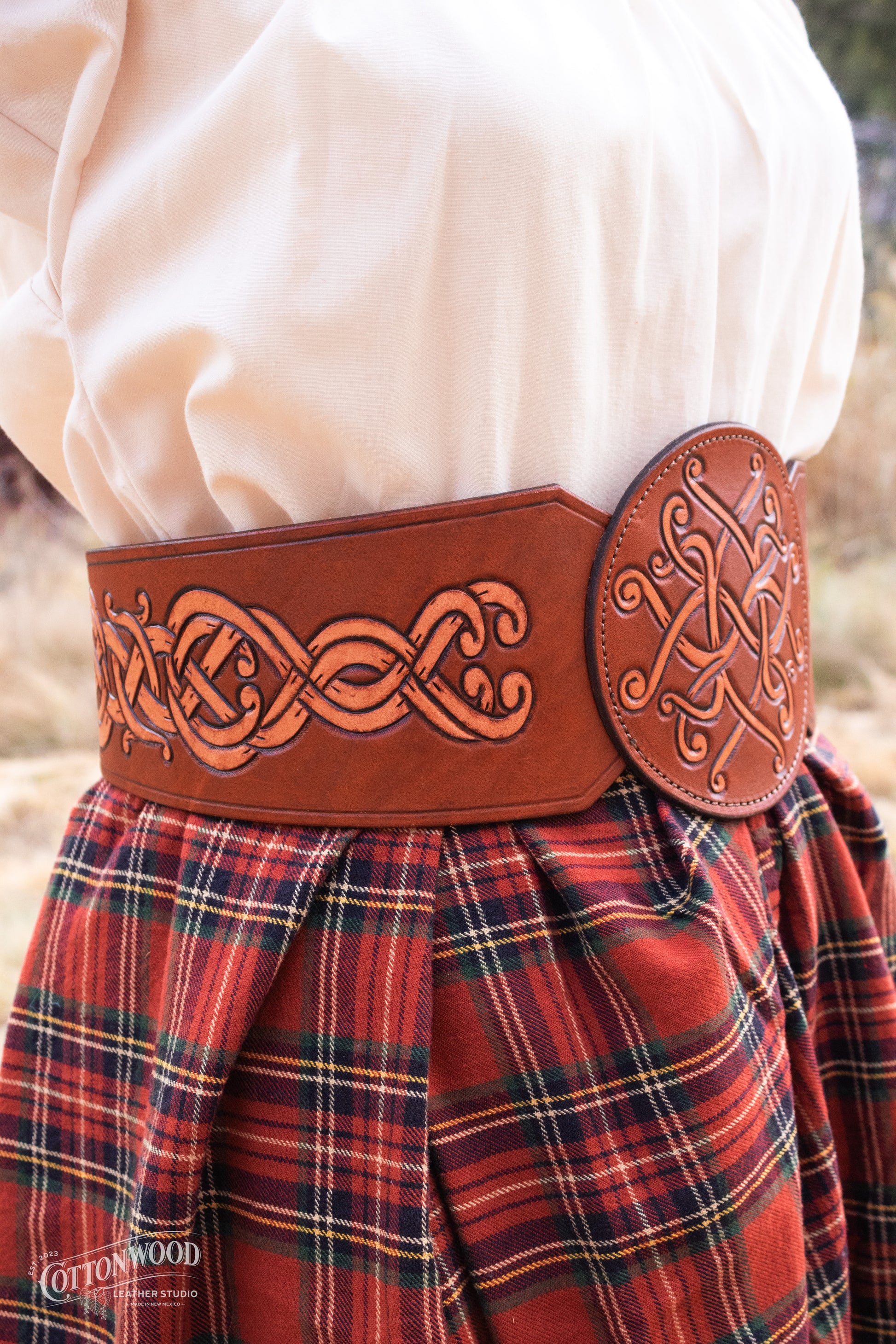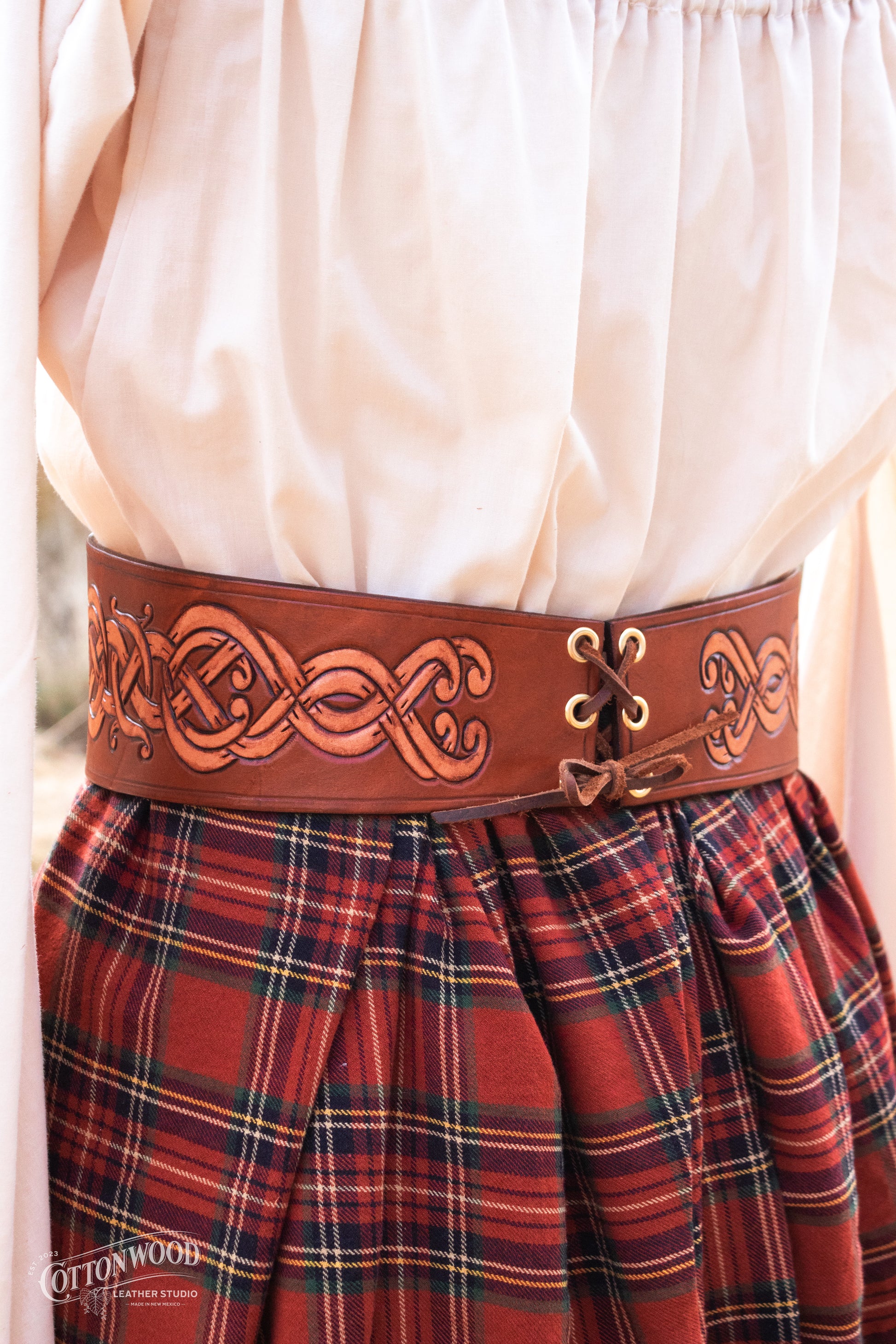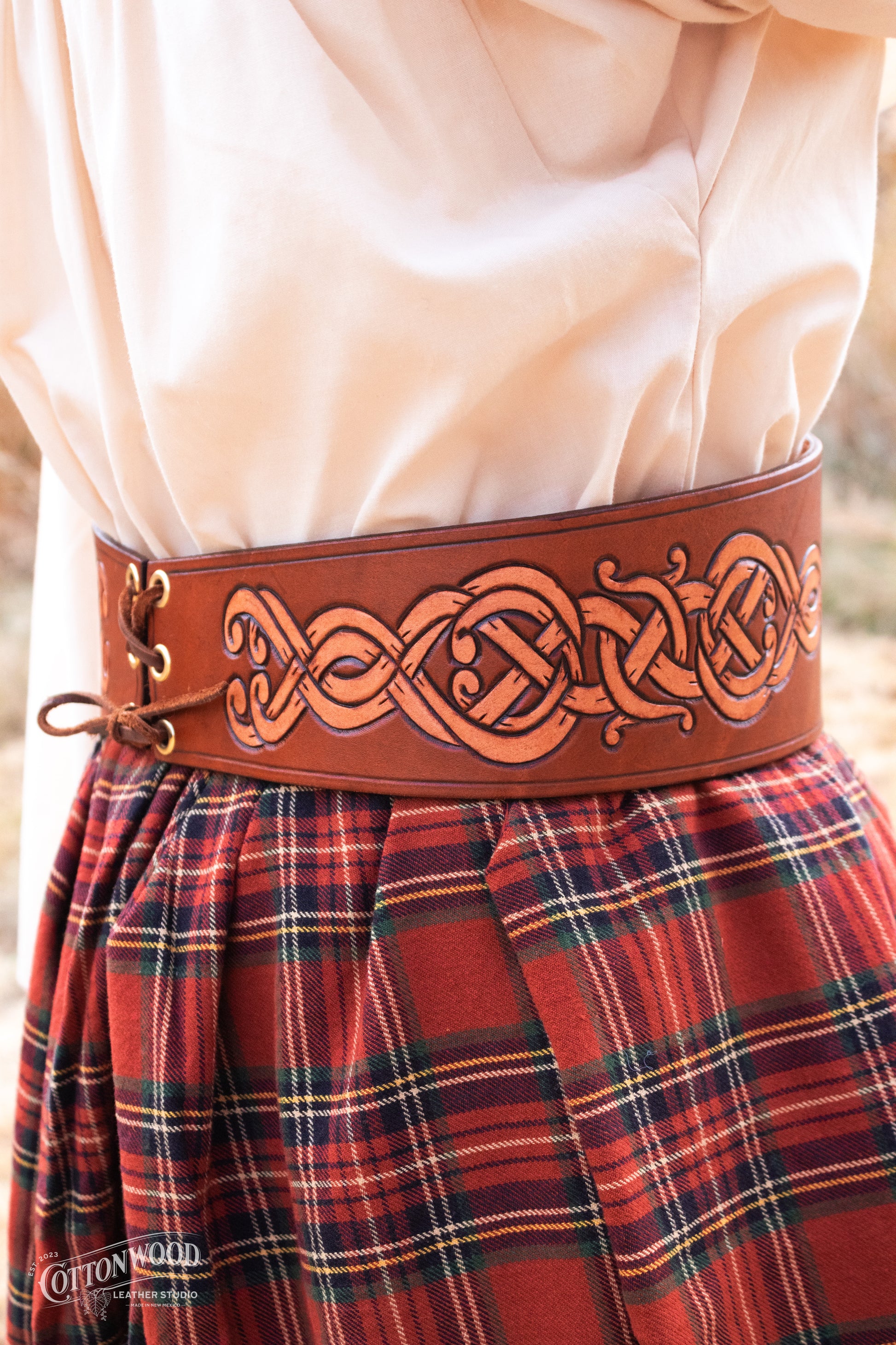 Hand cut and tooled, this corset is a show stopper with a Celtic design that will stand out on any outfit.