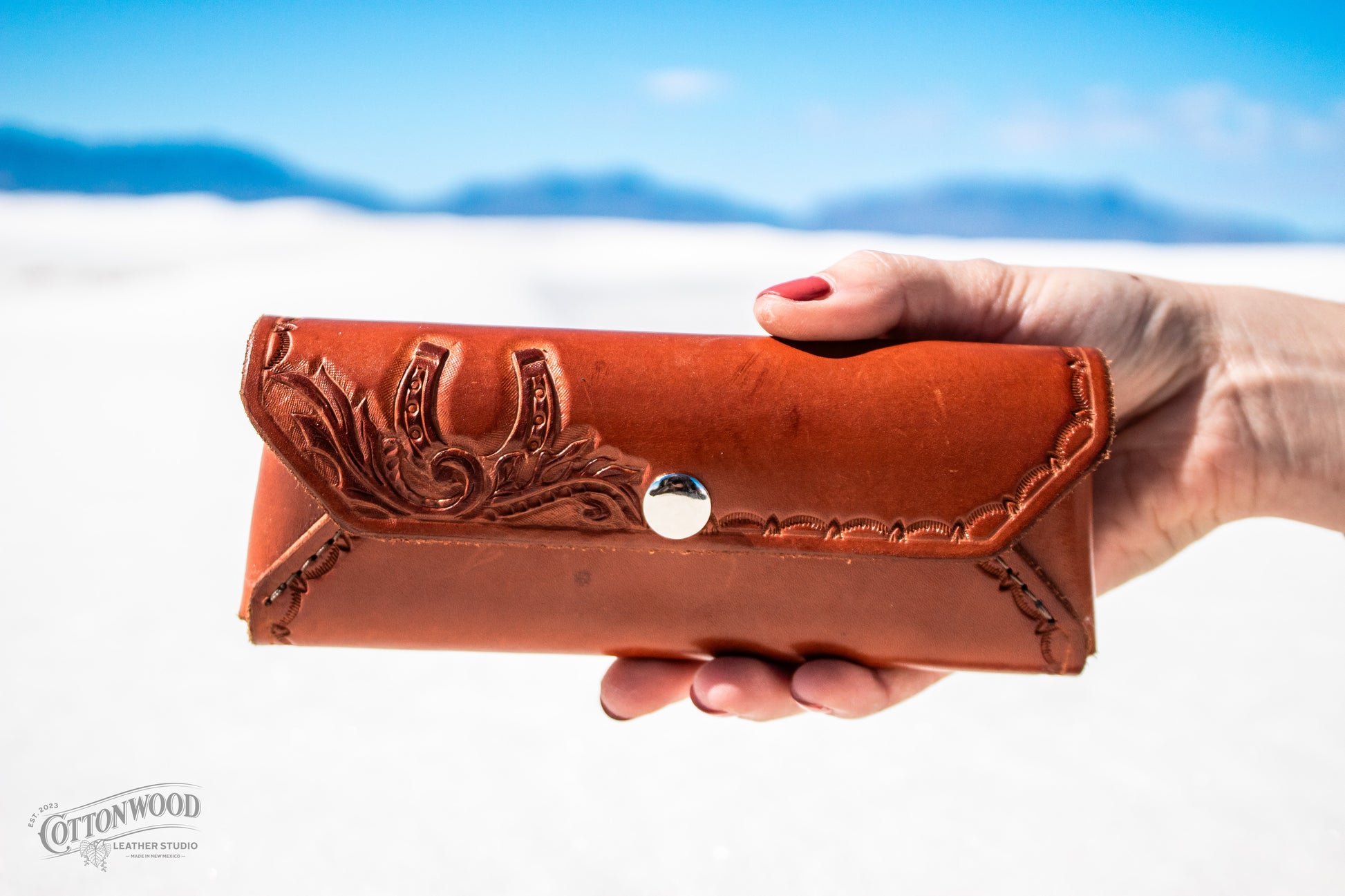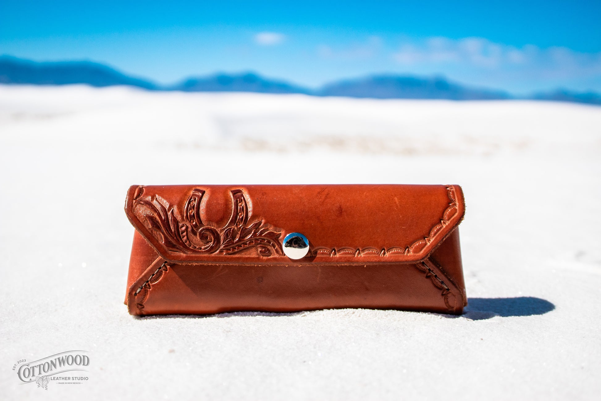 This handcrafted eyeglass case is sure to be the perfect home for your spectacles! The interior is unstained and soft, ensuring your glasses safety. Complete with a magnetic closure for ease of use.