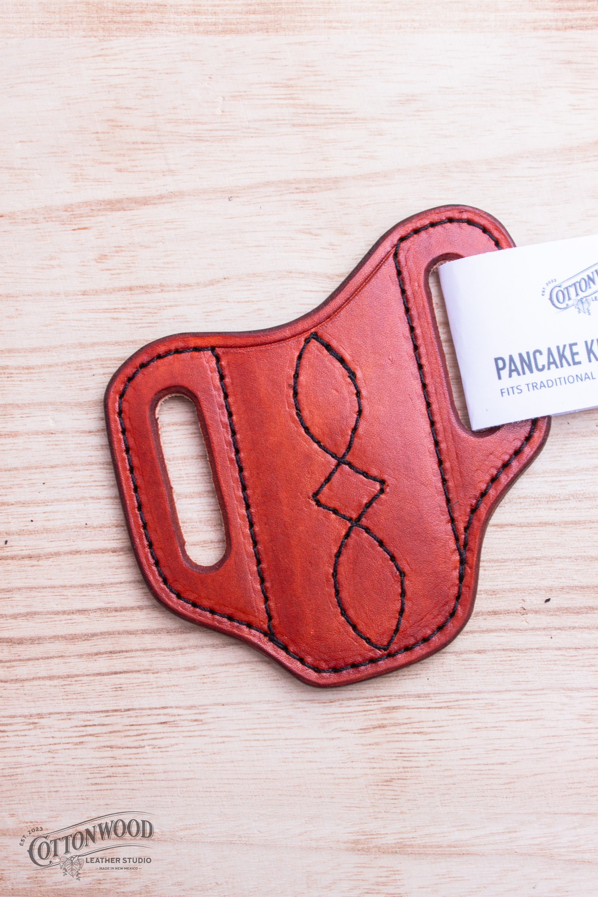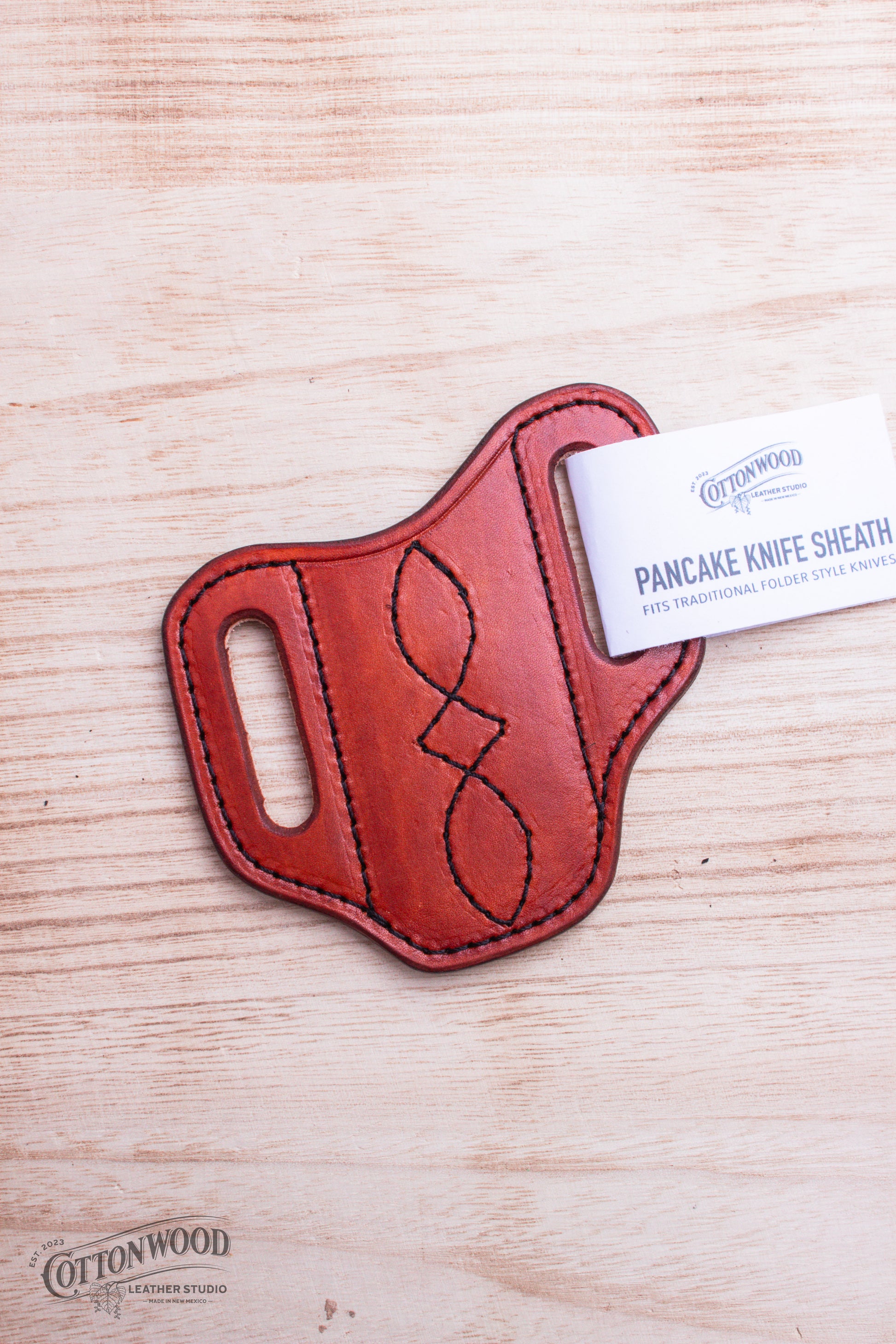 Handcrafted sheath perfect for your favorite pocket knife. Easily forms to any pocket knife. Knife pocket measures 1.75 inches X 3.5 inches, flat.