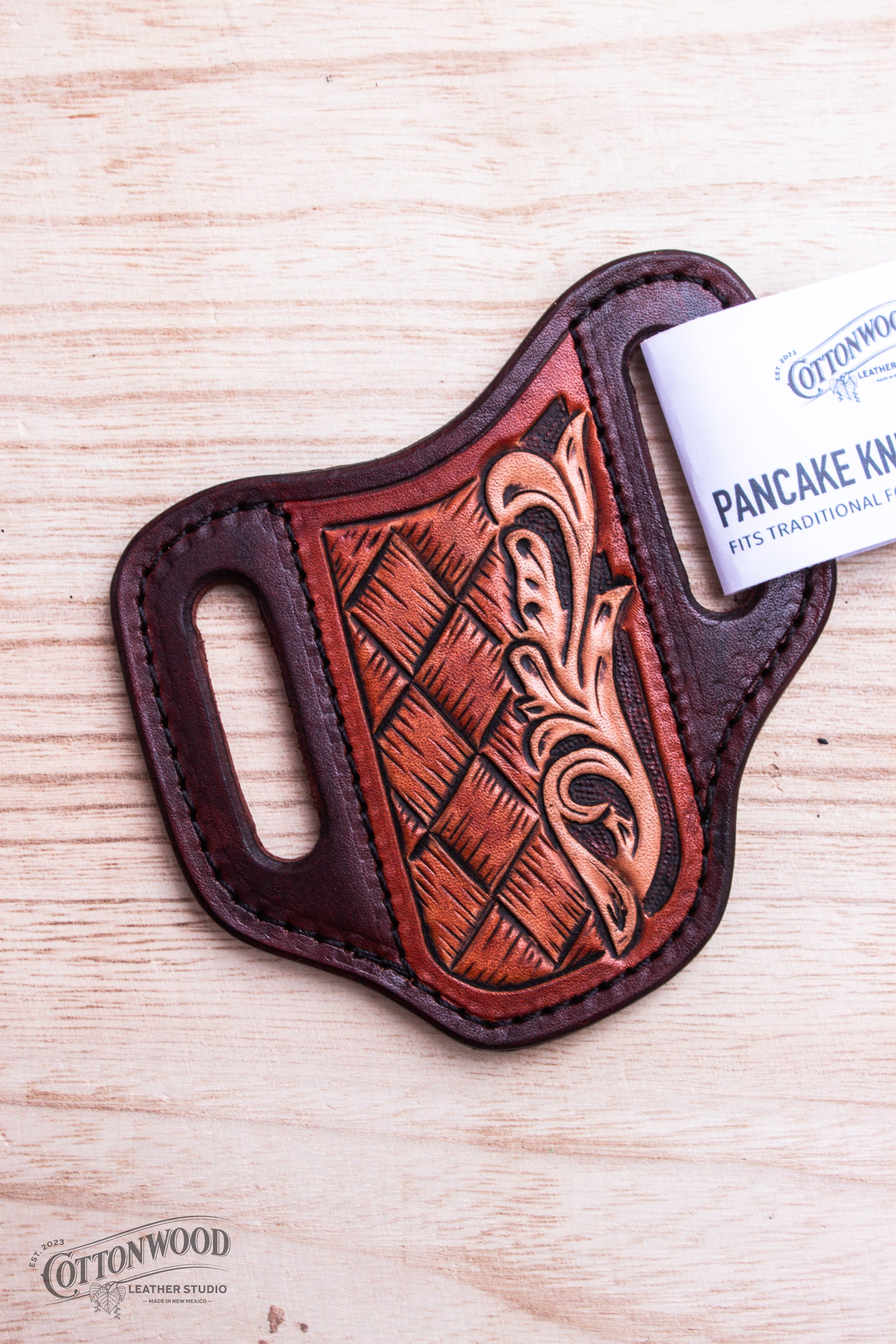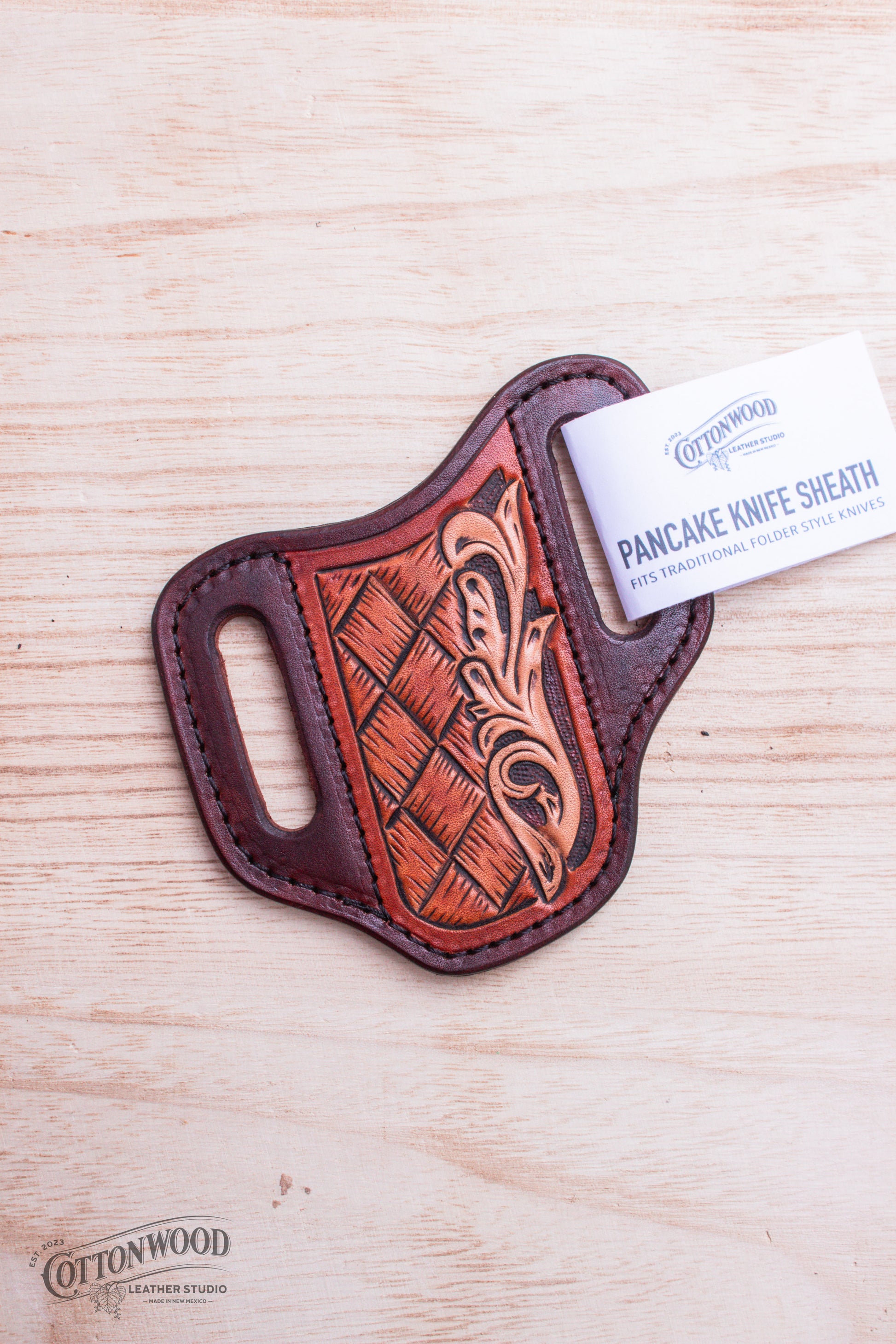 Handcrafted sheath perfect for your favorite pocket knife. Easily forms to any pocket knife. Knife pocket measures 1.75 inches X 3.5 inches, flat.